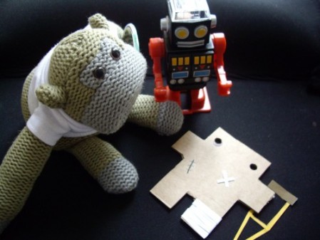 Fortunately, Gareth gave me the opportunity to look after the poor little fella and posted him to me, neatly wrapped in two envelopes. The other residents on my desk were rather excited about the new arrival and gave Cardboard Kid a warm welcome (only that lazy Rubix Cube couldn’t be bothered leaving his favourite spot in front of my screen). Updates on the kid’s way to recovery and his adventures with his new the button-eyed mates might follow (somewhere on Gareth’s website or facebook page).