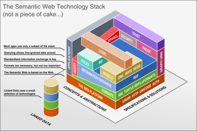 I just came across this 3-dimensional representation of the Semantic Web Layer Stack – or cake- handcrafted by Benjamin Nowack. The author also links to Jim Hendler’s talk on the Semantic Web Layercake (from 2009), possible the world’s first Semantic Web talk completely in rhyme. Jim’s talk gives a good overview of the evolution of the Semantic Web and how an incredible number of icing, sprinkles and candles was added to the layercake over the years.