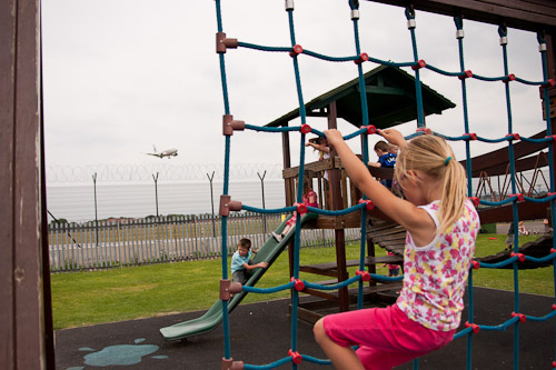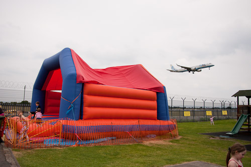 The Airport Hotel is a pub popular with plane spotters, as it is conveniently located right next to the runway, with its spacious beer garden only separated from the huge machines by a wire fence. As we went there on a Sunday afternoon it was completely packed out with spotters and families alike. The beer garden had a rather bizarre fun fair meets playground meets military training feel to it, as children were playing on the bouncy castle and the swings, waving the toy machine guns their loving parents had bought them at the nearby stall, while plane spotters with giant binoculars and radios were gathering at the fence. Probably the only place in the world where parents are happy to let their children run around in close proximity to men with binoculars.