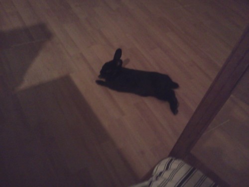 Under the dining table. One day, he just started sitting on one of the chairs, so I put a cushion on it. It’s an official bunny zone now, including the “oh no that’s Geth’s chair” warnings for visitors. Yeah. I know. I am that woman now.