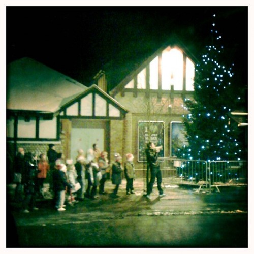 When we arrived at 7pm, there were, well, us, two of the organisers, and 5 police officers, obviously waiting for ‘the great West Didsbury Christmas riots of 2010′ to kick off. Some fantastically tasty mini mince pies (from the Dish and Spoon cake shop. CAKE. SHOP.) and a cup of hot spiced cider later, a surprisingly large group of people had gathered on the other side of the road opposite the Christmas tree to listen to the carol singers. The fact that the traffic on the road hadn’t been stopped made for a hilarious and mildly bizarre experience – the children singing Christmas carols, with the odd noisy car going past, drowning out the (highly enthusiastic) singers and blocking the view every so often. Being the evil person I am, I had trouble not to die laughing as a double-deck Stagecoach went past.